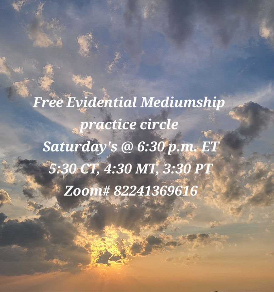 Evidential Mediumship Practice Circle ONLY. All Levels are welcome to observe or practice. Please be dressed and sitting up, in a quiet area free from movement or distractions. Act as if you are in a spiritual setting please.